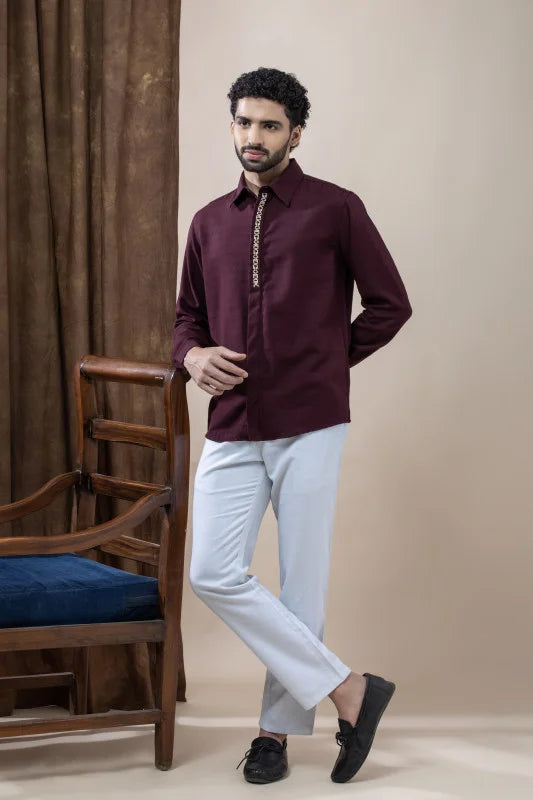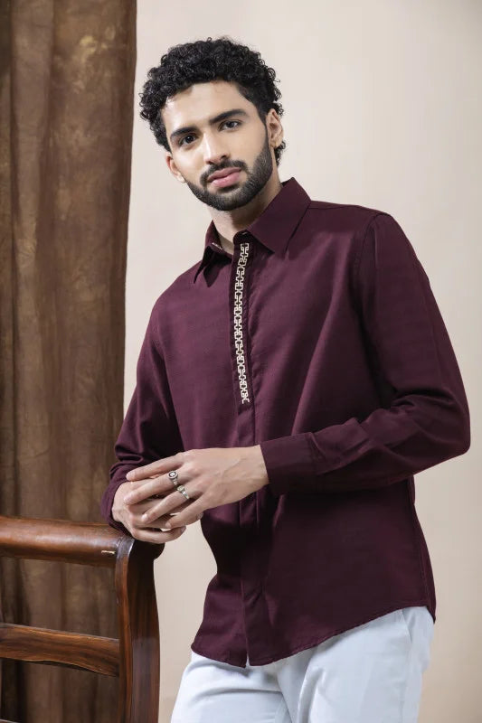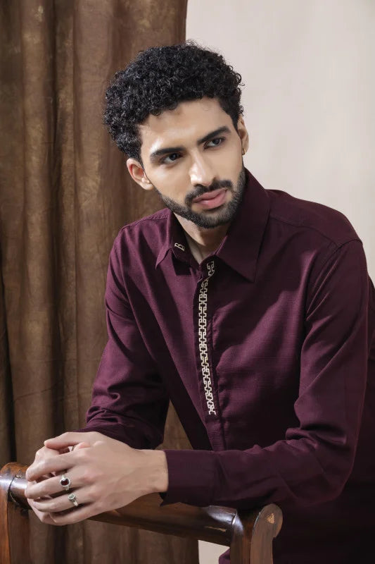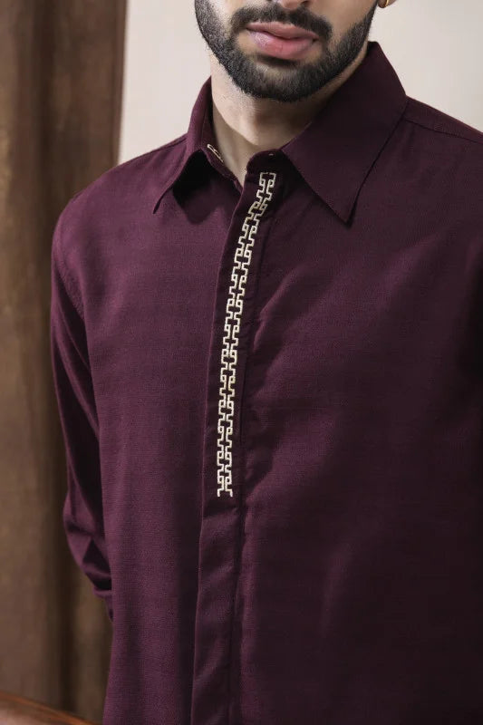 The standout feature is the signature Greek-Key inspired placket detailing, adding a touch of regal charm and modern sophistication. Its deep burgundy shade enhances the overall luxury appeal, making it an ideal choice for celebrations, special evenings, or elevated everyday dressing